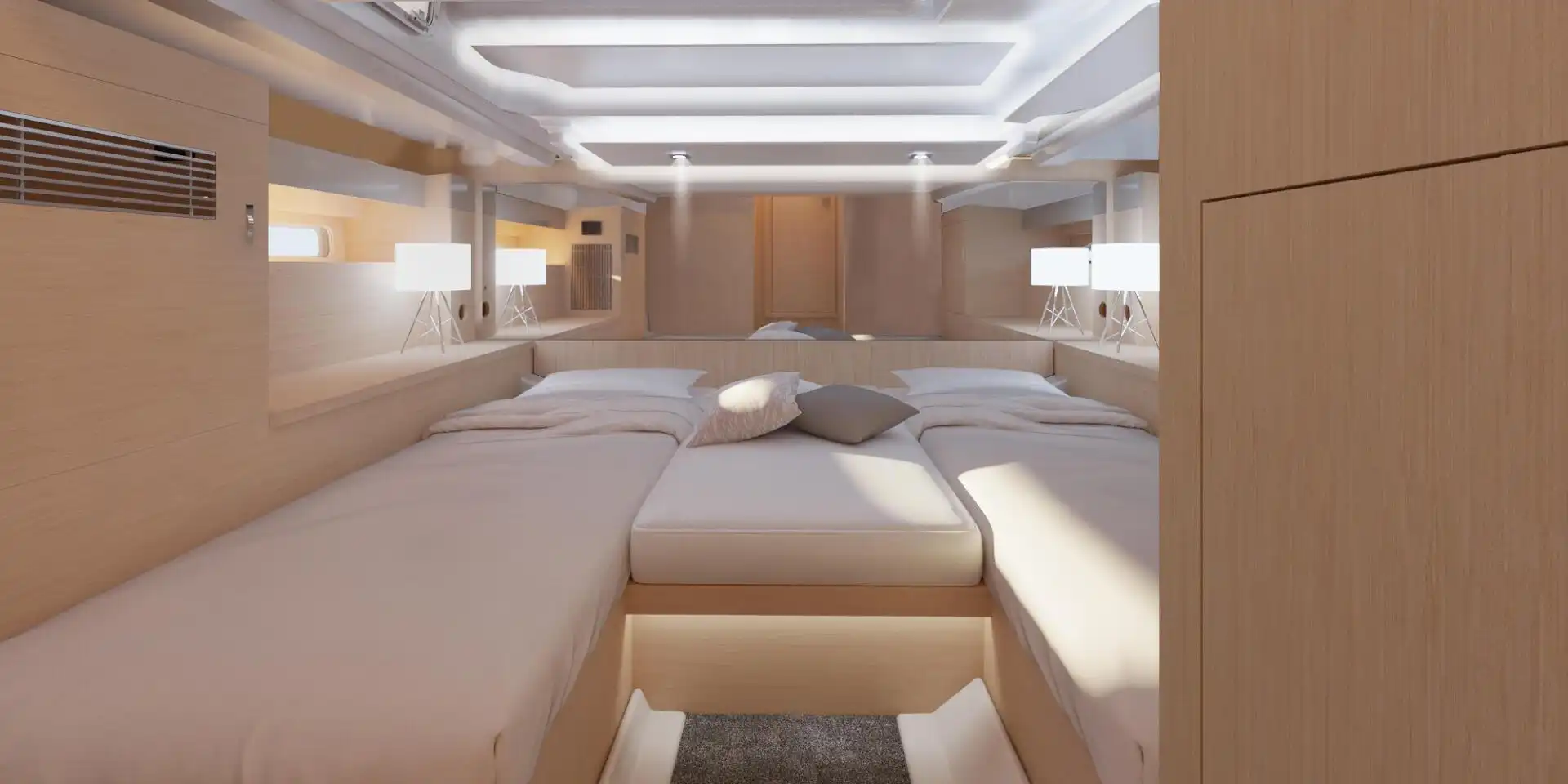 The DB/37 OB offers exceptionally fluid movement on board. At anchor, her side terraces can be deployed for even more space on board. Access to the sea is also facilitated by her vast aft swim platform. Gathered around the cockpit table in the saloon, guests enjoy an uninterrupted field of view, open to the scenery and the horizon. Parties, dinner with friends, or soaking up the warmth of the sun between dives… the choice is yours. But that’s not all: designed for shared pleasures, this day boat invites you to extend your cruise, with her two bright and comfortable, spacious cabins.