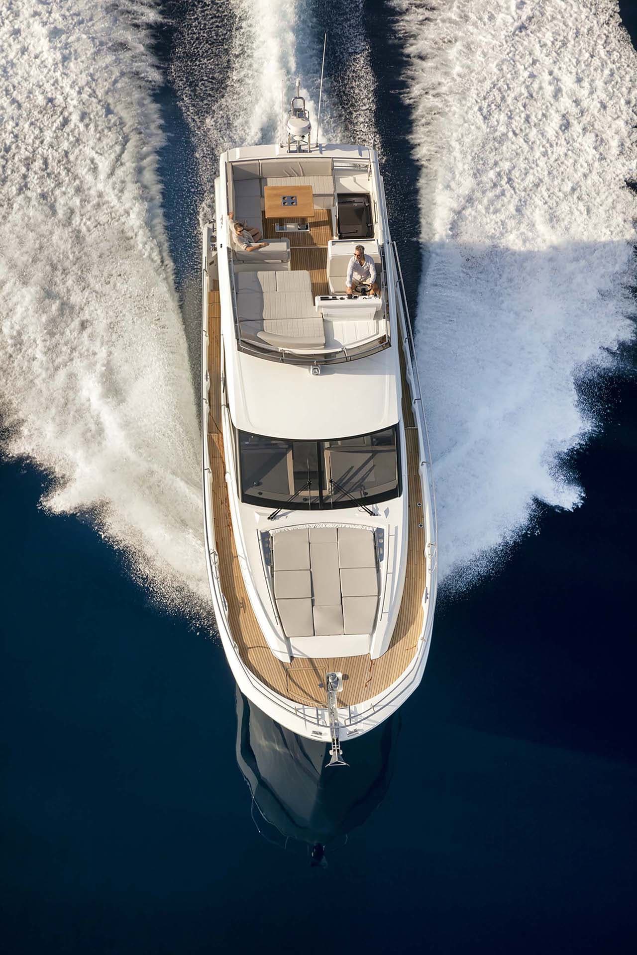 Intelligent and bright distribution; sunbathing areas in the bow and stern. Great for short and not so short trips. A very complete flybridge cruiser, with a distribution similar to that of the largest lengths in the range.