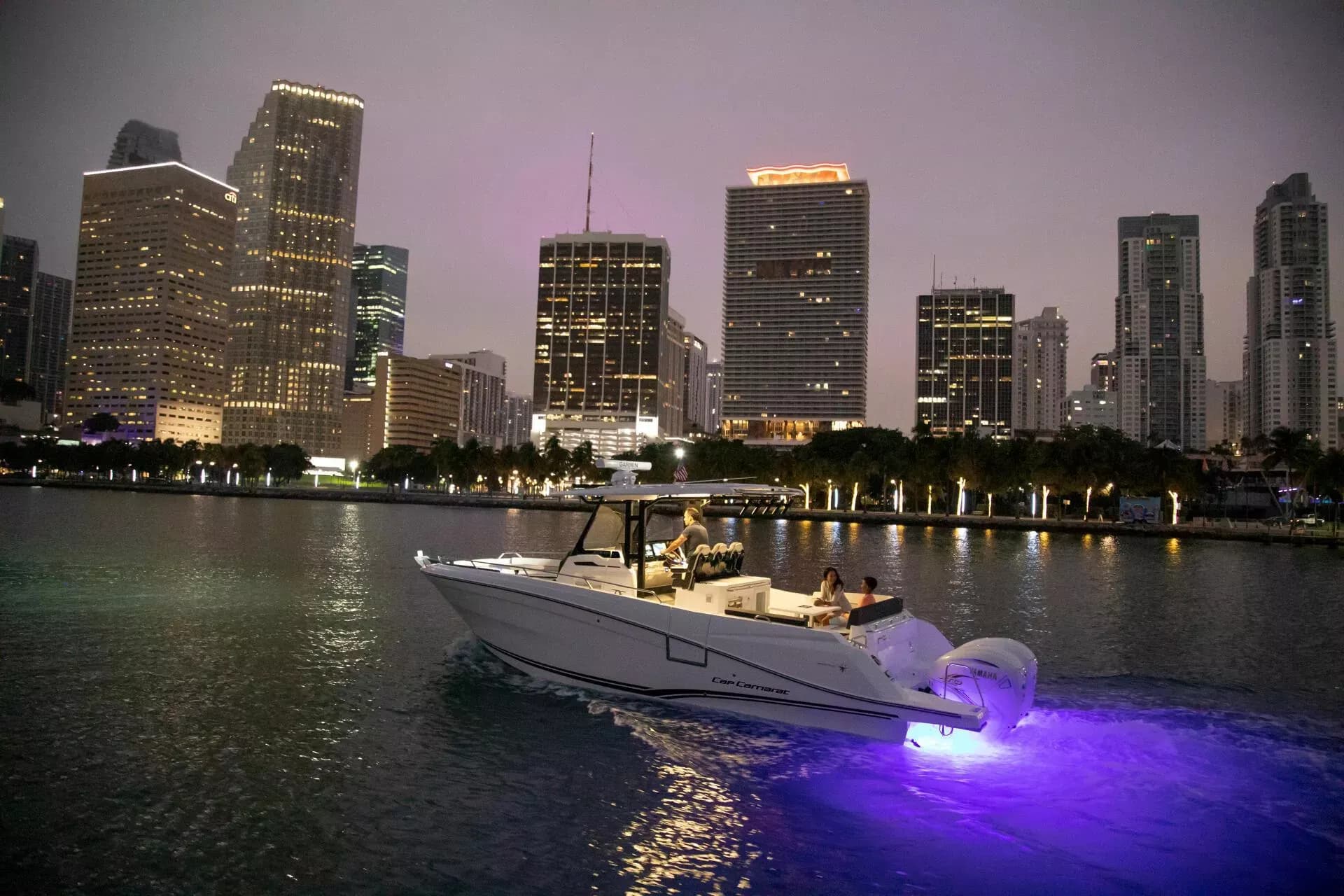 With its V-shaped hull design for excellent seakeeping, powerful twin engines, 2 x 350 HP with joystick, and ergonomic helm station, you will enjoy long fast runs, comfortably seated and in perfect safety.