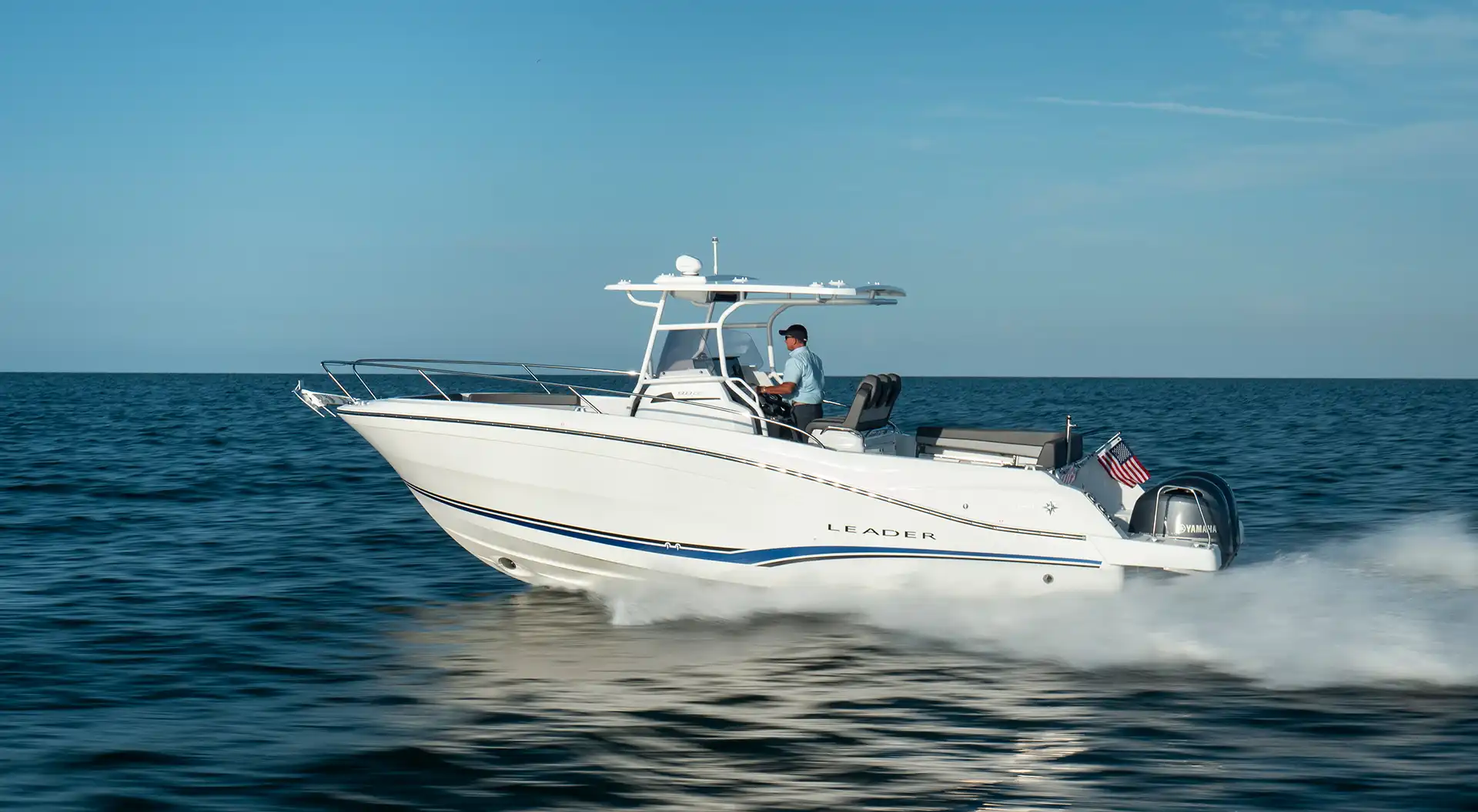 The Leader 9.0 CC offers you multiple ways to experience the water. Particularly well adapted for sport fishing, it features large sidedecks on one level for ease of movement around the boat, a vast storage locker, and in standard version, a leaning post incorporating a live well, a cooler, and rod holders. For use with family and friends, the leaning post can be equipped with a grill or stove, sink, refrigerator and tons of storage.