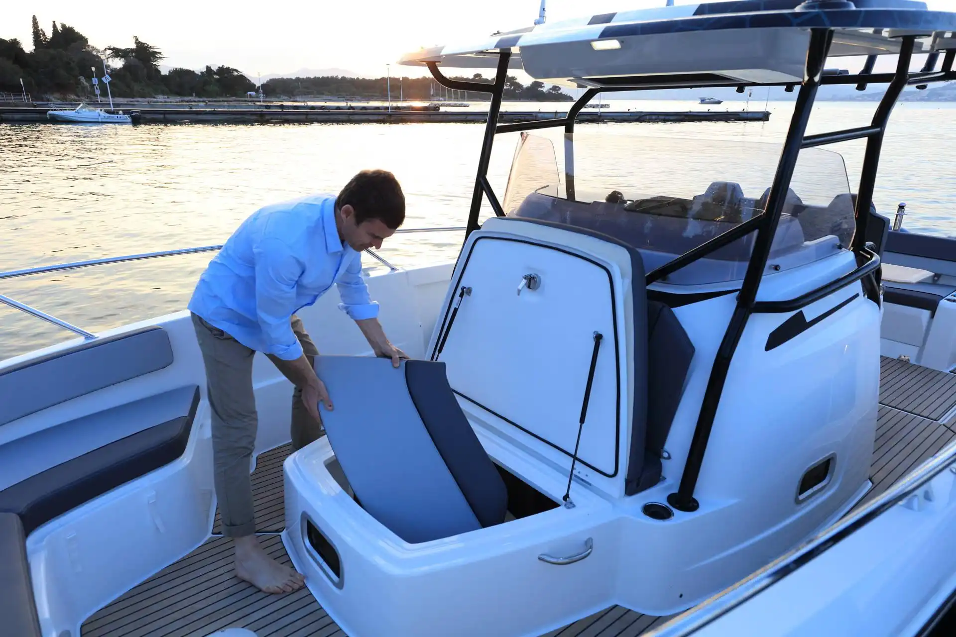 While the helm station has sleek seating for three while the vast forward and aft cockpits enable you to vary your activities, whether cruising or at anchor, where they can be transformed into a sundeck or saloon in a snap. Down below, the Leader 9.0 CC features a bright double berth with clever storage, as well as a separate shower and head compartment. An additional space can even be easily converted into an additional berth for two children. For family outings, boisterous fishing trips, or drinks with friends before a sunset… The Leader 9.0 CC is there for all your favourite moments on the water.